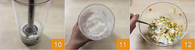 Insira o mixer de imersão no copo 10 e bata os ingredientes em velocidade média, até que a mistura se espesse 11, levará apenas alguns segundos. Em seguida, despeje a maionese falsa na tigela com os legumes e o ovo cortados em cubos e misture tudo 12, se necessário ajuste o sal e a pimenta.