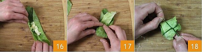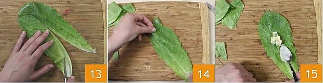 Agora lave e seque bem as folhas de alface, remova a parte central crocante com uma faquinha e divida ao meio 13. Depois de sobrepor as duas metades da folha 14, coloque uma colher de sopa da mistura no centro 15.
