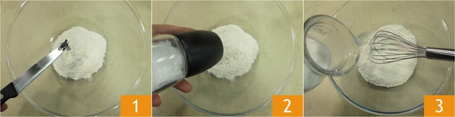 Para preparar o kaiserschmarren, comece colocando em uma tigela a farinha, as sementes de uma vagem de baunilha 1, uma pitada de sal 2 e o leite aos poucos, mexendo com um batedor 3.