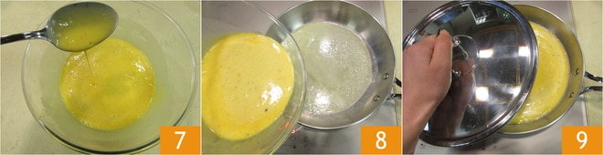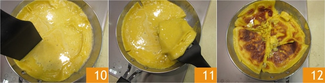 A massa deve ficar homogênea e bastante líquida 7: certifique-se de que não haja grumos. Pegue uma frigideira de aço e derreta completamente a manteiga em fogo baixo. Despeje a mistura na frigideira 8 e cozinhe por cerca de 3-4 minutos em fogo médio-alto, cobrindo com uma tampa 9.
