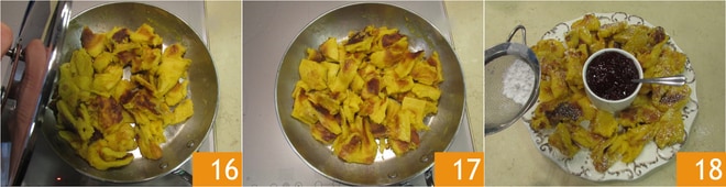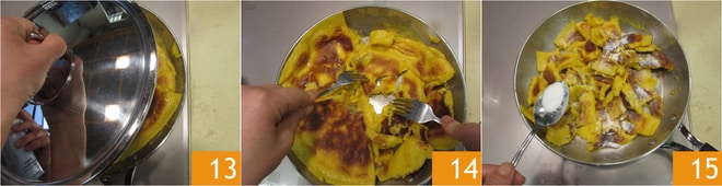 Cozinhe por mais 2-3 minutos, ainda com a tampa 13. Após esse tempo, você pode remover a tampa e "rasgar" com a ajuda de dois garfos, de modo a reduzir o kaiserschmarren em pedaços grosseiros e irregulares 14. Deixe saltear sem a tampa por mais alguns instantes, depois polvilhe com uma colher de sopa de açúcar granulado 15, para caramelizar.