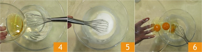 Quando você tiver incorporado o leite, adicione o rum 4, depois o açúcar 5 e, por último, os ovos 6 e continue misturando a massa com um batedor manual.
