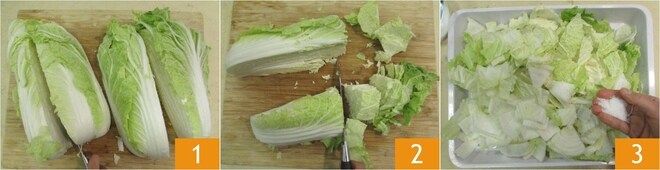 Para preparar o kimchi, comece com o repolho chinês: depois de lavá-lo, corte-o primeiro em quartos 1 e depois em pedaços grosseiros 2. Distribua o repolho em uma bandeja e polvilhe com sal 3, misture e deixe macerar por cerca de 30 minutos. Após esse tempo, misture novamente e deixe descansar por mais 30 minutos.