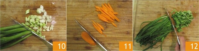 Lave os cebolinhos e corte-os em rodelas de cerca de meio cm 10. Limpe também as cenouras e corte-as em tiras 11. Por fim, corte o alho chinês em pedaços de cerca de 1 cm 12.