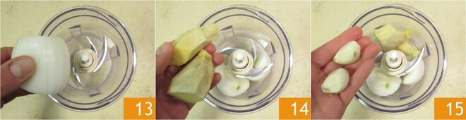 Passe para a pasta de gengibre: descasque a cebola e coloque-a em um mixer 13 junto com o gengibre descascado 14 e os dentes de alho 15.