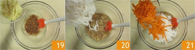 Adicione a pasta de gengibre 19, o daikon 20 e as cenouras 21.