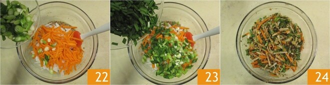 Adicione também o cebolinho 22 e o alho chinês 23, depois misture com uma espátula 24.
