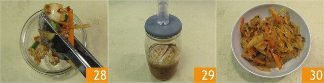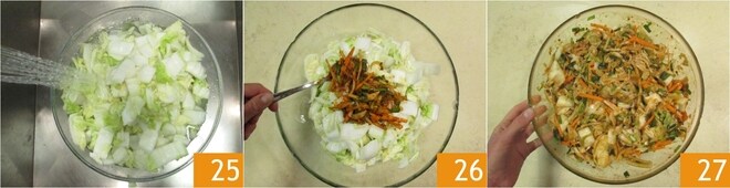 Após o tempo de maceração do repolho chinês, enxágue-o em água corrente 25 e escorra bem. Coloque o repolho em uma tigela e adicione os vegetais picantes 26. Misture com as mãos para integrar bem tudo 27.