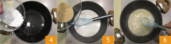 Enquanto isso, prepare o molho de arroz: coloque a água em uma panela junto com a farinha de arroz 4 e o açúcar mascavo 5. Misture com um batedor e cozinhe em fogo baixo até obter uma mistura gelatinosa 6.