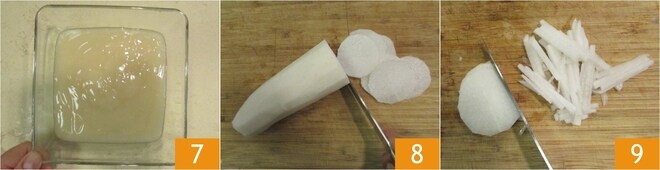 Transfira o molho de arroz para uma tigela e deixe esfriar à temperatura ambiente 7. Agora dedique-se ao restante dos ingredientes: descasque e corte o daikon primeiro em fatias 8 e depois em palitos finos 9.