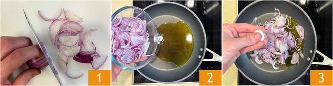 Para preparar a massa com atum e cebola, comece pelas cebolas: limpe-as e corte-as em fatias finas 1, depois coloque-as em uma frigideira com o azeite 2 e uma pitada de sal 3.