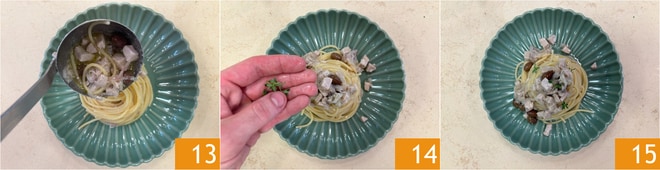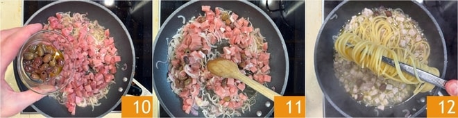 Adicione também as azeitonas 10 e salteie por mais cerca de 5 minutos em fogo alto 11. Enquanto isso, cozinhe o espaguete em água fervente com sal. Escorra a massa al dente e transfira-a para a frigideira com o molho 12, depois salteie rapidamente para amalgamar.