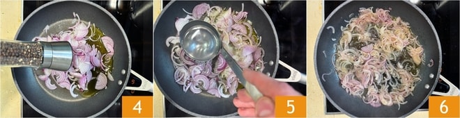 Adicione também a pimenta 4 e refogue lentamente, regando com uma concha de água 5. Cozinhe em fogo baixo com a tampa por cerca de 5 minutos, ou até que murchem 6.