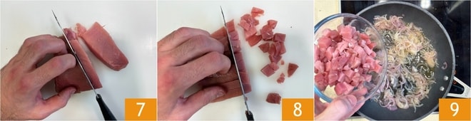 Enquanto isso, corte o filé de atum fresco em fatias de cerca de 1 cm de espessura 7, depois em tiras e finalmente em cubos, sempre do mesmo tamanho 8. Neste ponto, você pode juntar o atum às cebolas 9.