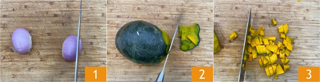 Para preparar a massa com creme de abóbora e guanciale, primeiro limpe e fatie a cebola 1. Limpe cerca de 500 g de abóbora 2, obtendo 430 g de polpa para cortar em cubos 3.