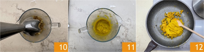 Bata com o mixer de imersão 10, para obter um creme 11. Despeje o creme obtido na panela 12 e reserve.