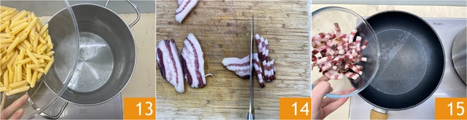 Cozinhe a massa em água fervente salgada 13. Corte o guanciale em tiras 14, então doure-o em uma panela ligeiramente aquecida, sem adicionar gordura 15: deve ficar crocante.