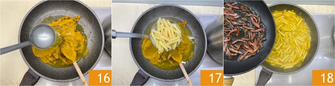 Dilua o creme com a água de cozimento da massa 16, escorra aqui o penne cozido 17 e adicione o guanciale crocante 18.