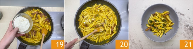 Misture a massa no fogo médio. Depois acrescente também o Parmigiano Reggiano DOP 19 e misture 20. Emprate e sirva a massa com creme de abóbora e guanciale com salsa fresca 21.