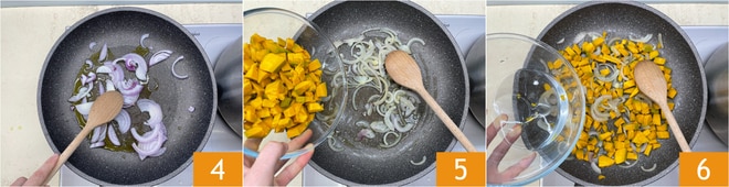 Em uma panela, aqueça o azeite de oliva extra virgem junto com a cebola 4, deixe refogar, e quando a cebola estiver macia adicione a abóbora 5, deixe cozinhar em fogo médio, depois salgue e adicione a água 6.