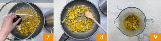 Cubra com a tampa 7 e cozinhe por cerca de 10 minutos em fogo médio, mexendo de vez em quando. Quando a abóbora estiver macia 8, transfira uma parte para um copo medidor 9.