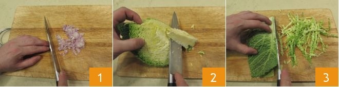 Para preparar a massa com truta, comece colocando uma panela com bastante água no fogo e adicione sal quando ferver. Enquanto isso, prepare todos os ingredientes que você vai precisar: limpe e pique finamente a chalota 1, depois lave e seque a couve, elimine as folhas mais externas e o talo central 2 e corte a parte restante em tiras 3.