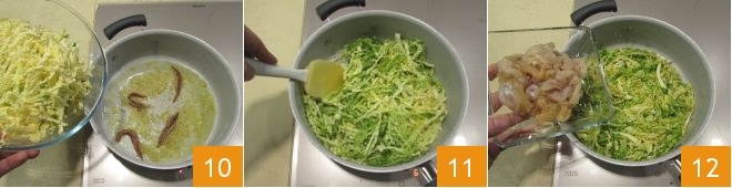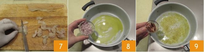 Corte os filés de truta em pedaços 7. Aqueça uma frigideira com o azeite de oliva extravirgem, adicione a chalota picada 8 e deixe-a murchar em fogo baixo por cerca de 5 minutos; quando a chalota estiver quase transparente, adicione as anchovas escorridas do óleo de conservação 9