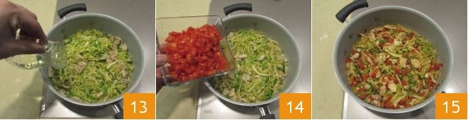e regue com o vinho branco 13, deixando-o evaporar completamente. Por último, adicione os tomates em cubos 14, ajuste o sal e a pimenta e cozinhe por 5-6 minutos, mexendo de vez em quando, depois desligue o fogo 15.