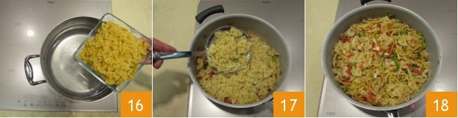 Enquanto isso, coloque as farfalle para cozinhar na panela com água fervente salgada a gosto 16. Escorra a massa al dente e coloque-a na frigideira junto com o molho 17, misture para incorporar tudo 18 e sirva sua massa com truta bem quente!