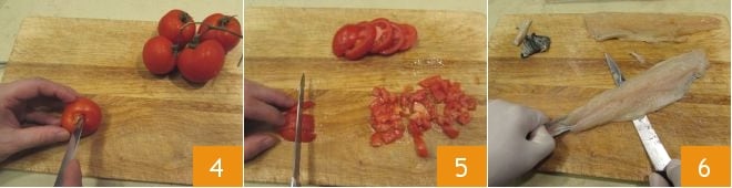 Enxágue os tomates, elimine a parte verde do caule 4 e corte-os primeiro em fatias e depois em cubos 5. Por fim, pegue os filés de truta: remova a pele deslizando delicadamente a faca ao longo da pele, começando da cauda até a cabeça 6, e passe os dedos pela carne para verificar se não há espinhas: se houver, você pode removê-las com uma pinça de cozinha.