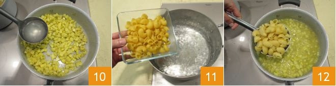 e adicionando uma concha de água fervente de cada vez quando necessário 10; levará cerca de 20 minutos. Quando as batatas estiverem quase cozidas, ajuste o sal e a pimenta. Enquanto isso, a água para cozinhar a massa deverá ter chegado à fervura, então cozinhe-a 11, depois escorra-a al dente diretamente na panela com as batatas 12,