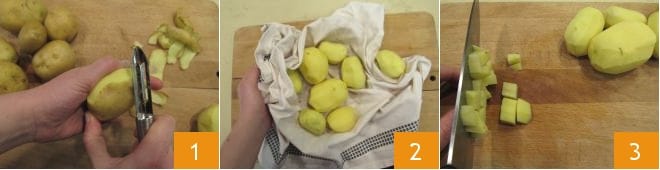 Para preparar a massa e batatas, antes de tudo descasque as batatas 1, depois lave-as e seque-as cuidadosamente com um pano de prato limpo 2 e corte-as em cubos 3.