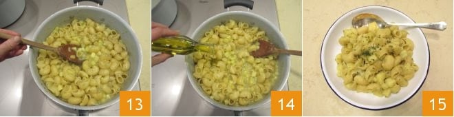 misture bem 13 e termine o cozimento adicionando um pouco de água de cozimento da massa, se necessário: ao unir massa e batatas na mesma panela se criará uma deliciosa cremosidade graças ao amido liberado pela massa e pelas batatas. Por último, adicione algumas folhinhas de tomilho e pimenta a gosto, desligue o fogo e tempere com um fio de azeite extravirgem cru 14. Sua massa e batatas está pronta para ser degustada ainda quente 15!