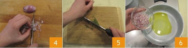 Limpe a chalota e pique-a finamente 4, depois pique também o alecrim 5. Coloque uma panela com bastante água para ferver, adicione sal quando começar a ferver, que servirá para cozinhar a massa e para diluir o molho. Aqueça o azeite de oliva extravirgem em uma panela, adicione a chalota 6