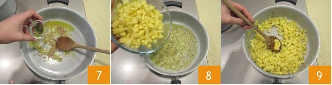 e o alecrim picado 7 e deixe dourar por alguns minutos, tomando cuidado para não queimar. Agora adicione as batatas em cubos 8 e cozinhe mexendo frequentemente 9