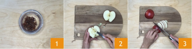 Para preparar as maçãs cozidas, primeiro coloque as passas de molho em água morna por 10 minutos 1. Lave bem as maçãs em água corrente. Divida as maçãs ao meio e retire o miolo 2, cortando-as em fatias finas 3.