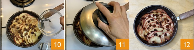 Cubra com água 10 e deixe cozinhar por 10 minutos com a tampa 11. Após esse tempo, termine o cozimento sem a tampa por mais 10 minutos para evaporar o excesso de água. Deixe esfriar um pouco e depois sirva as maçãs cozidas 12.