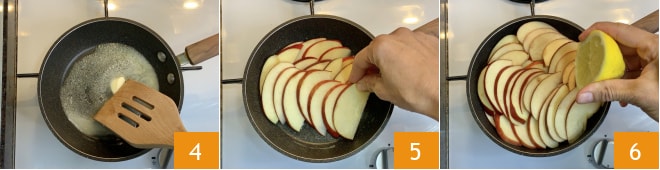 Derreta uma colher de manteiga em uma frigideira em fogo baixo 4, disponha as fatias de maçã sobrepondo umas às outras 5. Esprema o suco de meio limão 6.