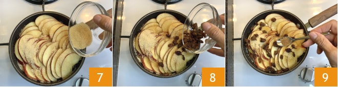 Adicione o açúcar mascavo 7, as passas 8 e um toque de canela 9.