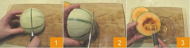 Para preparar o melão recheado de frutas e sorvete, comece cortando ao meio cada melão 1. Em seguida, corte a tampa de ambas as metades 2, de modo a dar um apoio às suas taças de melão. Com uma colher ou um boleador, remova as sementes e os filamentos do centro do melão 3.