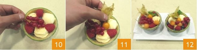 Distribua as bolinhas de melão e os frutos vermelhos nas tacinhas, adicione as framboesas, e finalmente decore cada taça com um raminho de groselha 10, um physalis 11 e uma folhinha de hortelã. Seu melão recheado de frutas e sorvete está pronto para ser servido 12!