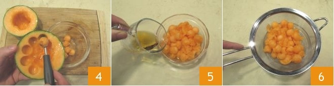 Com o boleador, retire a polpa do melão em bolinhas 4 e coloque-as em uma tigela. Regue as bolinhas de melão com o Grand Marnier 5 e deixe marinar por cerca de 30 minutos. Após o tempo necessário, escorra o melão da marinada 6 e coloque-o em uma tigela.