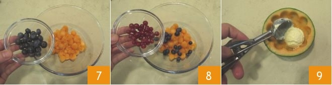 Adicione os mirtilos lavados 7 e as groselhas 8, reservando 4 raminhos inteiros para a decoração. Pegue as tacinhas de melão já esvaziadas e preencha-as com o sorvete 9, colocando 3 bolas em cada taça.