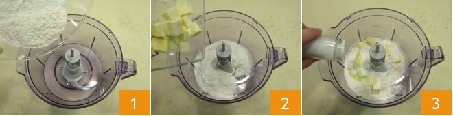 Para preparar as mini tatin de abacaxi, comece pela massa brisée: em um processador, coloque a farinha 1, a manteiga fria da geladeira cortada em cubos 2 e uma pitada de sal 3.