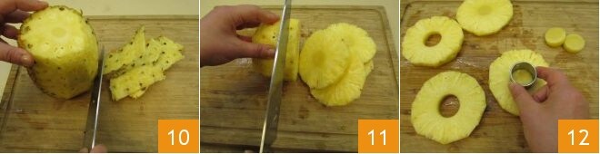 Agora, com um cortador de biscoitos de 10 centímetros de diâmetro, recorte mais 4 das 5 fatias de abacaxi 13; para obter 4 fatias perfeitamente redondas e iguais entre si, depois reserve-as por um momento. Retome a outra fatia de abacaxi, com o cortador de 3 cm, obtenha 4 rodelas da parte mais tenra e suculenta da fatia 14. Em seguida, corte o que resta da fatia em cubos de cerca de meio centímetro 15