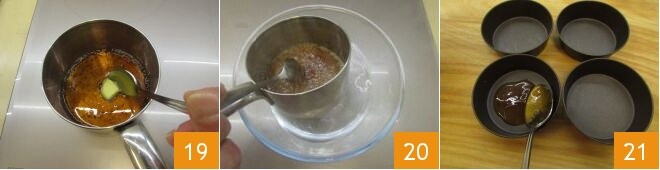 e misture bem 19 até que esteja completamente derretida. Assim que a manteiga derreter, retire a panela do fogo e mergulhe-a em uma tigela cheia de água fria 20, sem deixar a água entrar na panela. Isso servirá para interromper o cozimento do caramelo. Pegue 4 formas de 10 centímetros de diâmetro e despeje o caramelo 21,