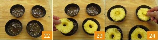 cobrindo uniformemente o fundo 22. Nesse ponto, coloque uma fatia de abacaxi em cada forma 23 e feche o buraco central com as rodelas que você cortou anteriormente com o cortador de biscoitos 24