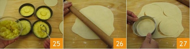 em seguida, distribua sobre cada fatia o abacaxi em cubos, em partes iguais 25. Nesse ponto, retire a massa brisée da geladeira e estenda-a 26 até atingir uma espessura de 5 milímetros. Pegue um cortador de biscoitos com diâmetro de 11,5 centímetros e corte 4 discos de massa 27.