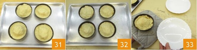 Cubra cada forma com o disco de massa brisée 28 e, pressionando delicadamente com os dedos, sele bem as bordas 29. Fure a superfície com os dentes de um garfo 30.