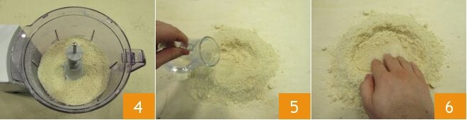 Bata tudo até obter uma textura arenosa e farinhenta 4. Nesse ponto, transfira a mistura para uma superfície de mármore, metal ou vidro (desde que esteja fria) e forme a clássica forma de fonte. Adicione a água fria aos poucos 5, misturando rapidamente. Continue amassando com os dedos 6, tentando aquecer a massa o mínimo possível.